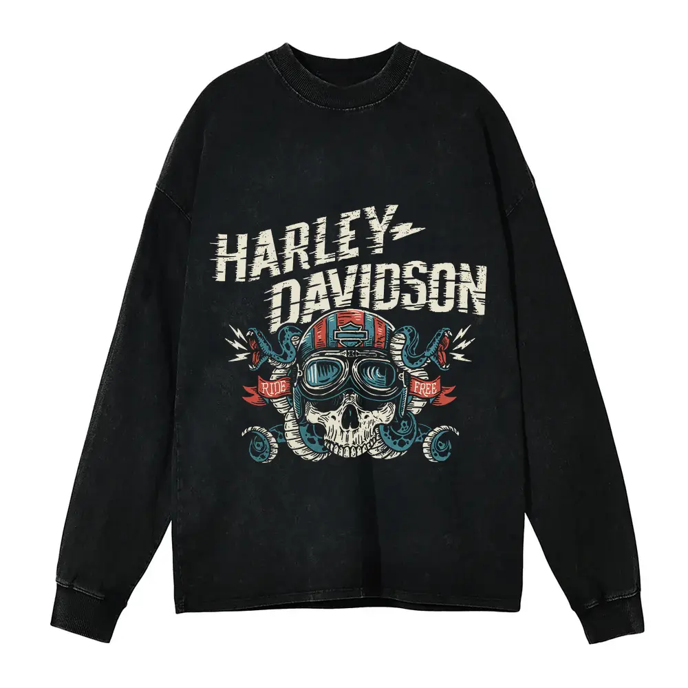 Harley Davidson Skull And Spanners Aicd Wash Oversized Long Sleeve Shirt