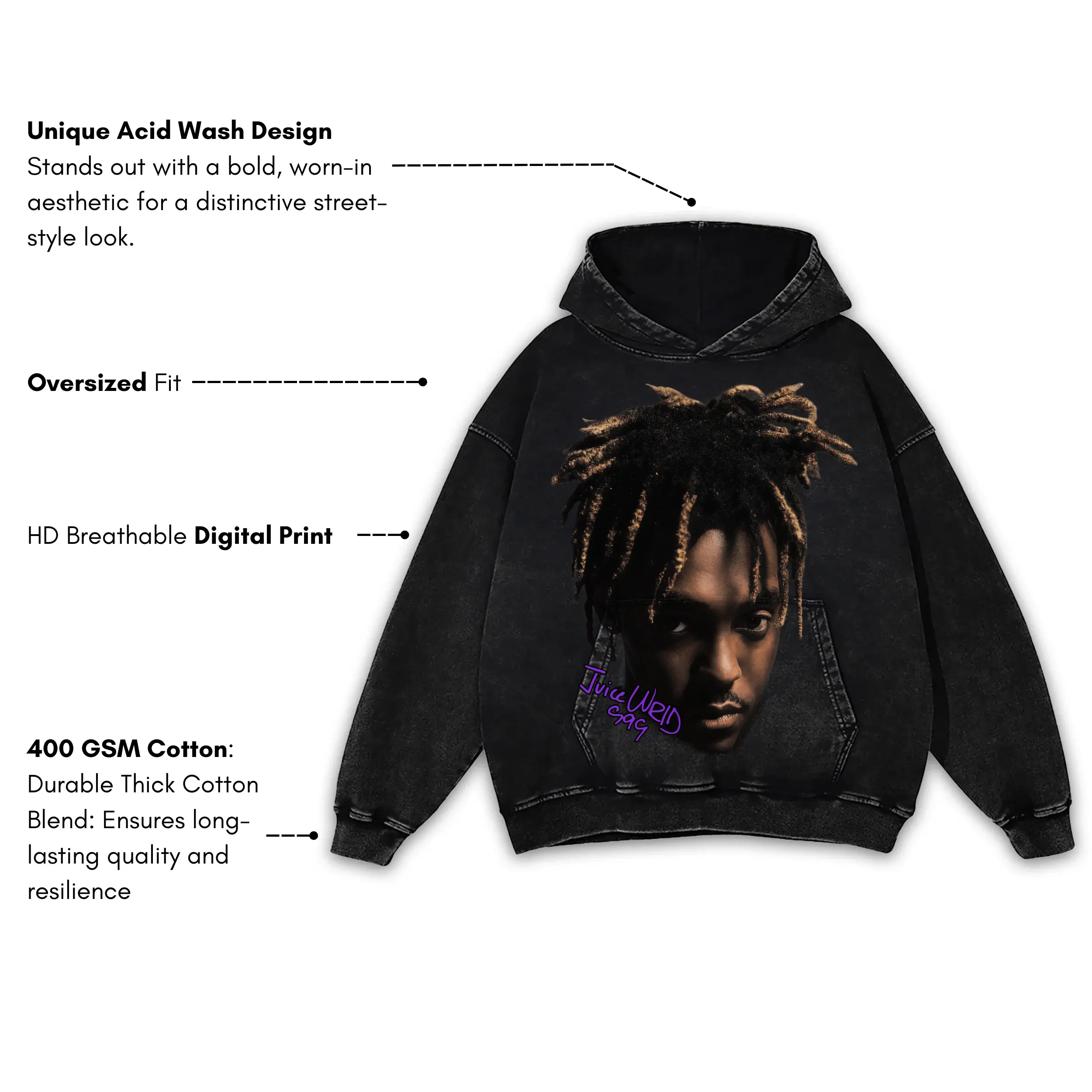 Retro Purple x Juice Wrld ‘Portrait’ Vintage Acid Wash Hoodie – Black