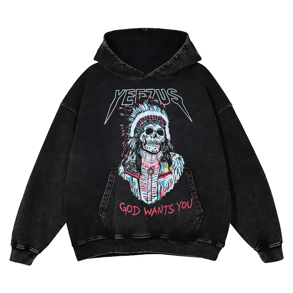 Yeezus Headdress Skull Aicd Wash Oversized Hoodie